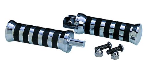 BILLET FOOTPEGS are available for both rider and pasenger. Uniquely intergrated rubber banding provides excellent traction and grip. CNC'd from aluminum billet stock, polished and chrome plated. Easy installation.