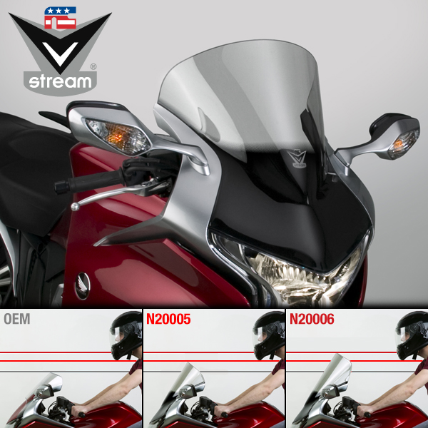 Honda VFR 1200 F National Cycle revolutionizes windscreen performance with the VStream® Windscreen! The patented "V" shape and advanced dimensional contours push the wind vortex away from the rider's head, resulting in a peaceful, quiet riding environment. The passenger's comfort is improved as well. Thick, sturdy FMR hardcoated Lexan ® polycarbonate. DOT approved,One-piece screen replaces OEM two-piece unit. Uses existing mounting hardware for a direct replacement.