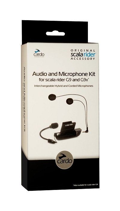 Cardo Scala Rider Audio & Mic Kit G9X inc Hybrid and Corded Mic in Box - SRAK0027 Using a second helmet and don't want to ride without your scala rider? The G9x Audio Kit is your solution. Equipped with both hybrid and corded micrphones, and detachable 32mm speakers.