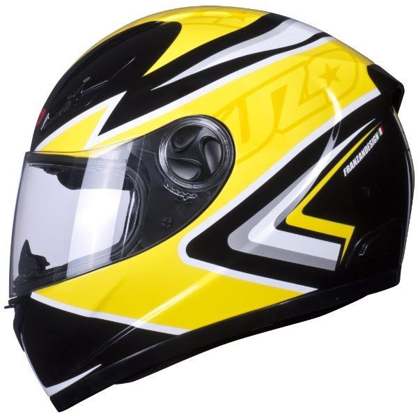 NEW Tuzo Ghost Motorcycle Crash Helmet ECE Approved With Yellow Graphic Design. The Helmet Is Also Available In Red, White/Red, Green, Orange, Blue and Pink Graphic Designs.