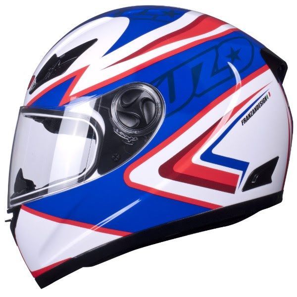 NEW Tuzo Ghost Motorcycle Crash Helmet ECE Approved With Blue Graphic Design. The Helmet Is Also Available In Red, White/Red, Green, Orange, Yellow and Pink Graphic Designs.