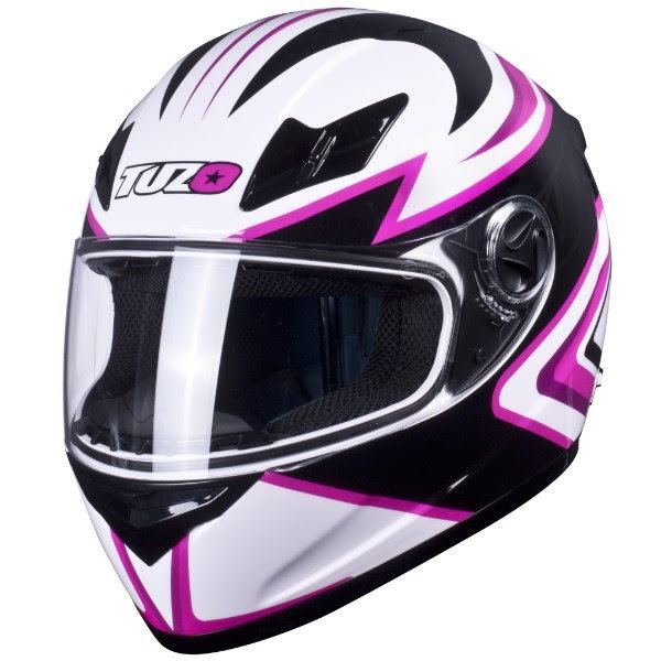 NEW Tuzo Ghost Motorcycle Crash Helmet ECE Approved With Pink Graphic Design. The Helmet Is Also Available In Red, White/Red, Green, Orange, Yellow and Blue Graphic Designs.