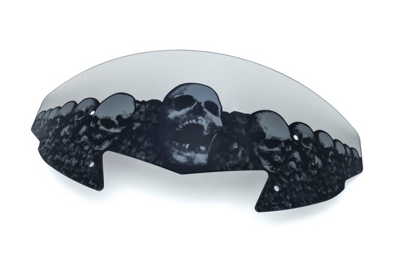 Kuryakyn is fired up to offer this top-quality, custom windshield for Victory Cross Country & Magnum models. This high-end windshield is custom-formed from premium materials using a proprietary process. Manufactured from quality, hard-coated polycarbonate that will not crack or shatter upon impact unlike acrylic. Choose between the Catacomb, Tribal and Zombie designs that are screen-printed with proprietary ink, making the images unbelievably sharp and durable. The center air scoop has been enlarged to reduce turbulent airflow and match the sharp lines of the fairing. Graphics are printed behind a light smoke material and fill the bottom portion of the windshield, leaving the top clear for an unobstructed view. Windshield is 10" tall.