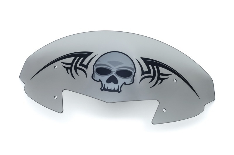 Kuryakyn is fired up to offer this top-quality, custom windshield for Victory Cross Country & Magnum models. This high-end windshield is custom-formed from premium materials using a proprietary process. Manufactured from quality, hard-coated polycarbonate that will not crack or shatter upon impact unlike acrylic. Choose between the Catacomb, Tribal and Zombie designs that are screen-printed with proprietary ink, making the images unbelievably sharp and durable. The center air scoop has been enlarged to reduce turbulent airflow and match the sharp lines of the fairing. Graphics are printed behind a light smoke material and fill the bottom portion of the windshield, leaving the top clear for an unobstructed view. Windshield is 10" tall.