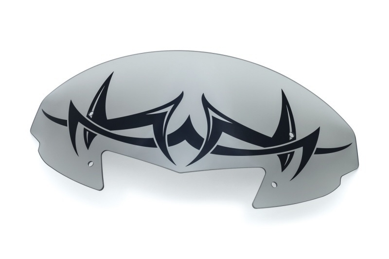 Kuryakyn is fired up to offer this top-quality, custom windshield for Victory Cross Country & Magnum models. This high-end windshield is custom-formed from premium materials using a proprietary process. Manufactured from quality, hard-coated polycarbonate that will not crack or shatter upon impact unlike acrylic. Choose between the Catacomb, Tribal and Zombie designs that are screen-printed with proprietary ink, making the images unbelievably sharp and durable. The center air scoop has been enlarged to reduce turbulent airflow and match the sharp lines of the fairing. Graphics are printed behind a light smoke material and fill the bottom portion of the windshield, leaving the top clear for an unobstructed view. Windshield is 10" tall.