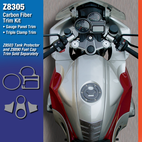 Genuine carbon fibre cloth comes alive under a crystal clear poured resin topcoat. ZTechnik's close attention to precision fit means all edges will align to contours exactly. Kit includes Speedo Gauge Trim and Triple Clamp Trim.