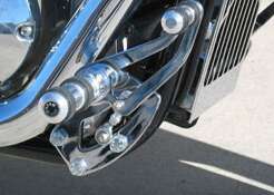 Polished, high strength, aluminium alloy, beautifully chromed and exceptionally designed, with fold up, billet aluminium footpegs. Includes all necessary mounting hardware for a perfect fit and a quick installation. Moves Drivers foot position forward