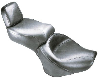 Mustang completely eliminates that pushed-forward feeling many riders have on a stock Virago seat. The look of a two-piece seat and separate backrest pad are all built on a single baseplate. The deeply pocketed front bucket features a full 15" of lateral support. The 12.5" passenger seat extends forward to provide additional driver back support. The 9" wide rear backrest is integrated into the seat.