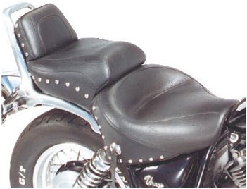 Mustang completely eliminates that pushed-forward feeling many riders have on a stock Virago seat. The look of a two-piece seat and separate backrest pad are all built on a single baseplate. The deeply pocketed front bucket features a full 15" of lateral support. The 12.5" passenger seat extends forward to provide additional driver back support. The 9" wide rear backrest is integrated into the seat.