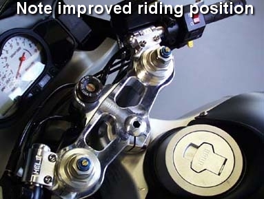 The 'Tour Performance® Top Triple Clamp' by Heli replaces your factory clamp, retaining your stock handlebars, hydraulic lines and cables. The new bar position will be 1" taller & 1 1/2" more rearward than stock.