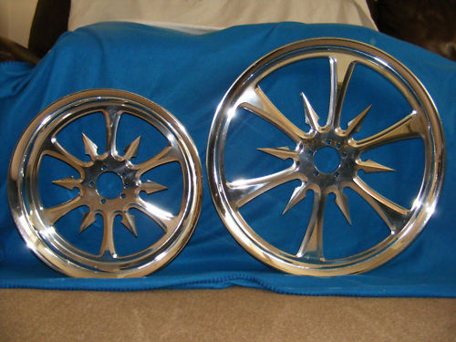 Please note this set of wheels do not come with the hubs hence the bargain price. they can be purchased from a RC Components dealer ie Us  depends on HD Big Dog AIH or whatever bike you have as all hubs are interchangable between wheels and so if you have something other than a Harley you can get these to fit your bike. Or alternativly get your local custom shop to make you some hubs Or alternativly get your local custom shop to make hubs , we keep discs and pulleys to match plus many other RC parts in stock up to 330 tyre  width !