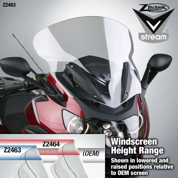 ZTechnik revolutionizes windscreen performance! The advanced 'V' shape and dimensional contours push the wind vortex out and away from the riders' helmet, resulting in a peaceful, quiet environment This improvement is notable for the passenger as well.